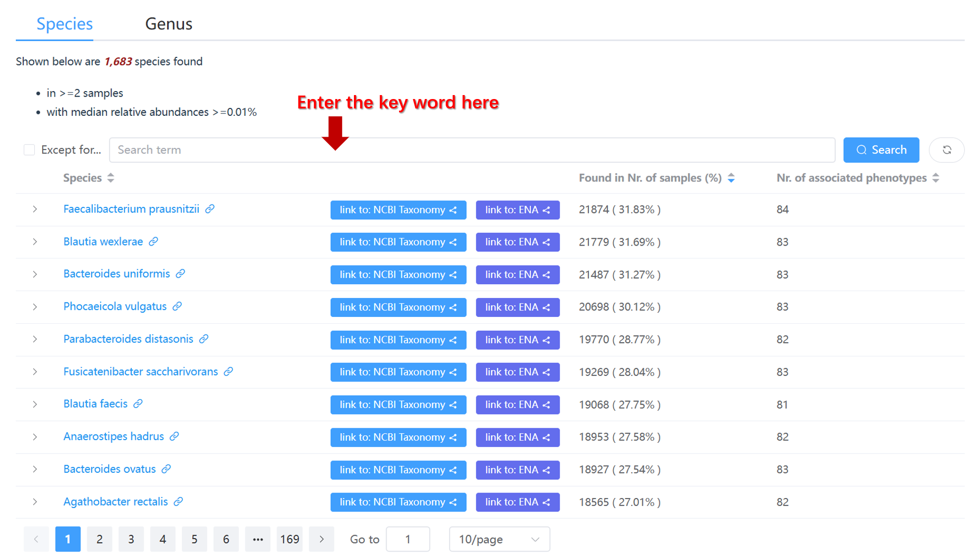 Users can first go to the All taxa, and search in the Species or Genus tables: