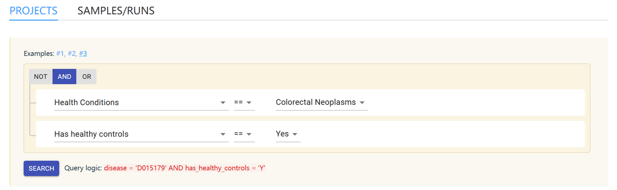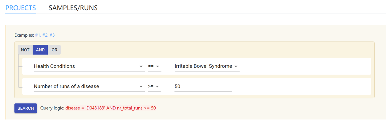GMrepo is equipped with two graphical data selectors to allow users to quickly build complex queries to find projects and runs of interest; see below: